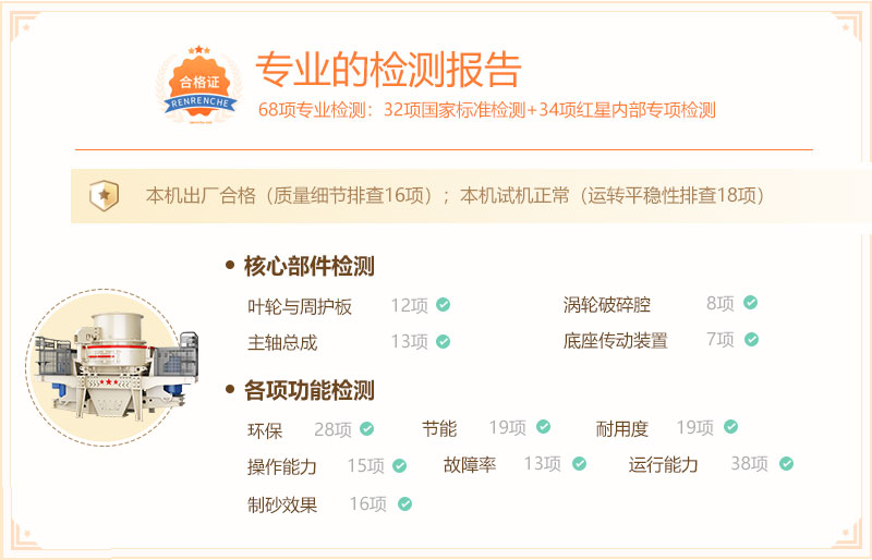 檢驗(yàn)結(jié)果:經(jīng)專業(yè)檢測(cè),該設(shè)備無(wú)論是核心部件還是各項(xiàng)功能均達(dá)標(biāo),并表現(xiàn)非常良好,核心零部件結(jié)實(shí)耐用、壽命長(zhǎng);日常操作靈活便捷、故障少,且具有效能高、高產(chǎn)、節(jié)能、環(huán)保、成品效果好等諸多亮點(diǎn)。設(shè)備綜合情況非常不錯(cuò),符合現(xiàn)代化石料廠需求設(shè)備標(biāo)準(zhǔn)。詳細(xì)的報(bào)告細(xì)節(jié)如下:
